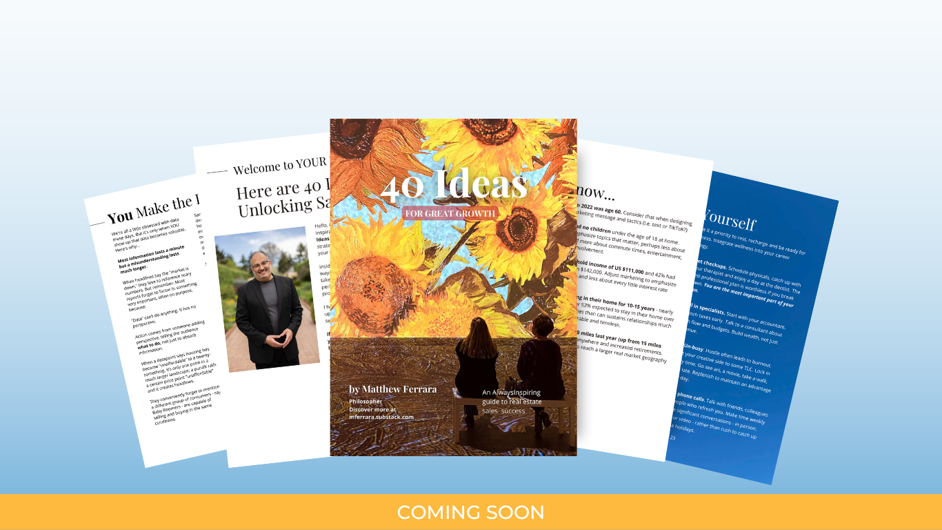 Here are 40 Ideas for Unlocking Sales Success! From the AlwaysInspiring Philosopher, International Speaker, Photographer, and Real Estate Industry Innovator, Matthew Ferrara's 40 Ideas for Great Growth guide, is filled with strategies, data, insights and tips for helping your organization grow.